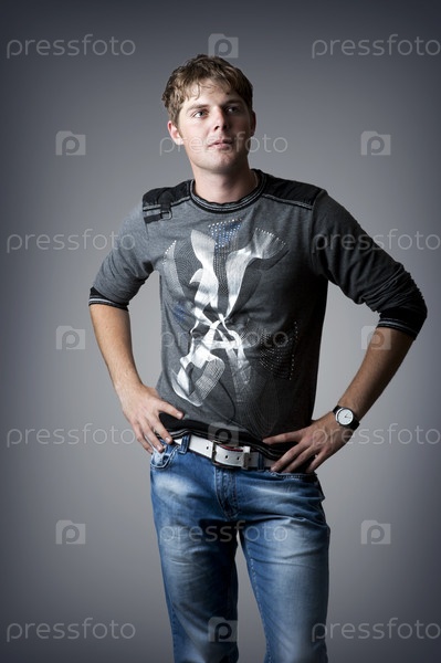 Молодой стильный мужчина на сером фоне