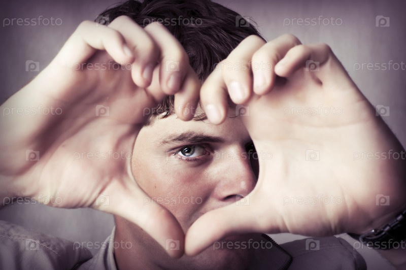 Молодой человек показывает знак любви при помощи пальцев