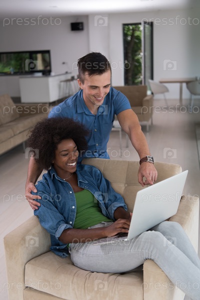 Пара на кресле с ноутбуком
