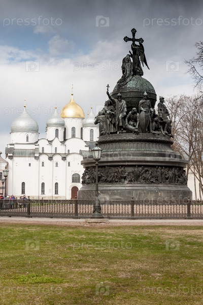 ВЕЛИКИЙ НОВГОРОД, РОССИЯ - 13 мая: Собор с памятником в Кремлевской крепости, Россия - 13 мая 2017 года