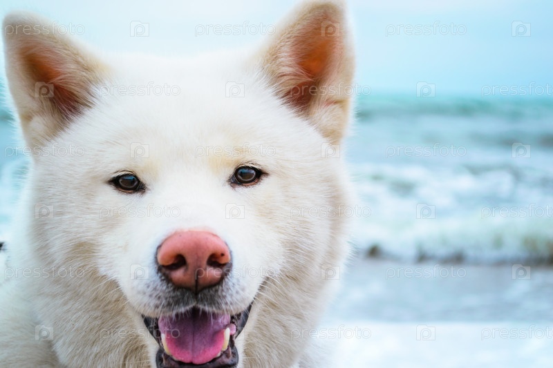 Белая японская собака Акита на пляже у моря