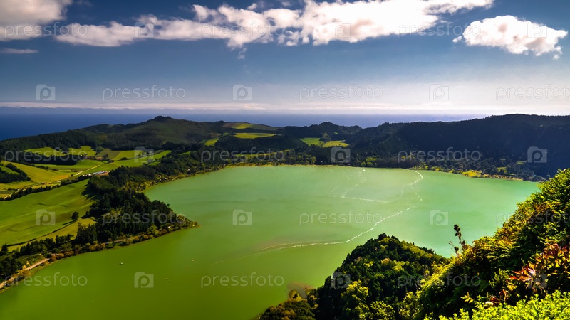 Вид с воздуха на озеро Фурнас в Сан-Мигеле, Азорские острова, Португалия
