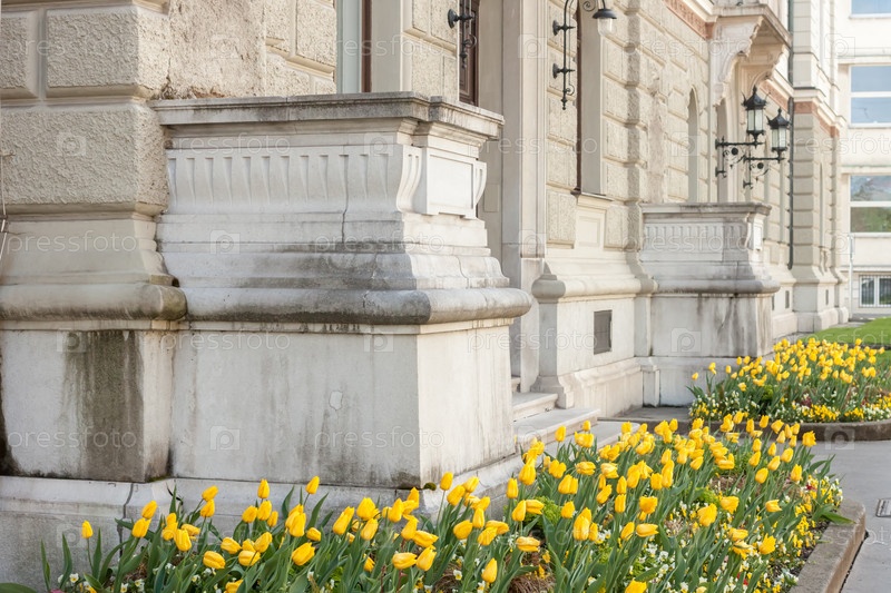 Красивый фасад университета с клумбой