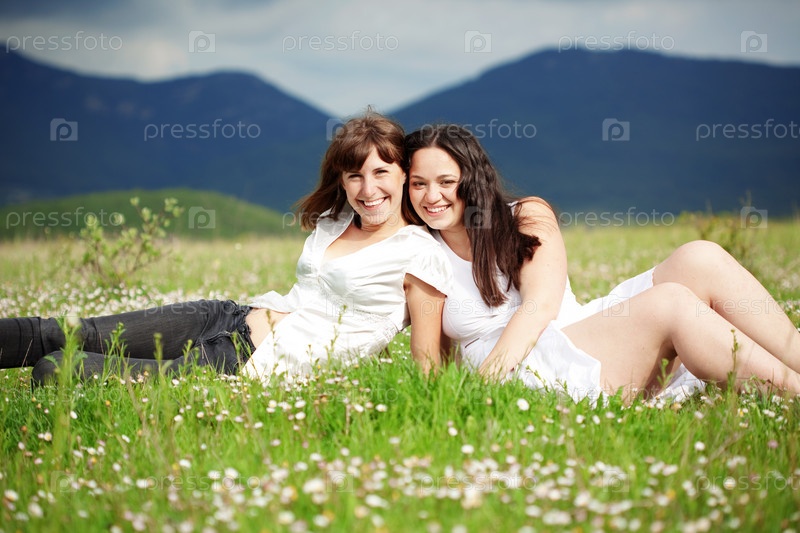 Две улыбающиеся девушки на зеленом лугу