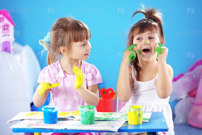 Две девочки с испачканными гуашью руками сидят за столом