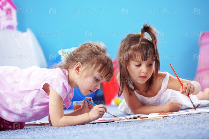 Две девочки рисуют красками, лежа на полу