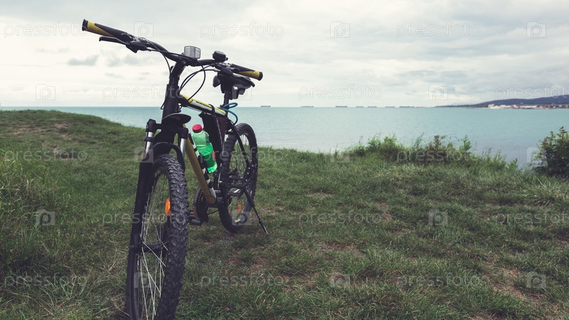 Велосипед на зеленой траве на у берега моря