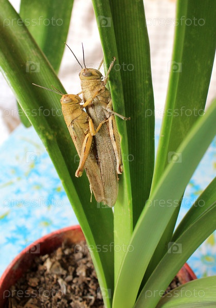 Две саранчи на зеленом листе амариллиса