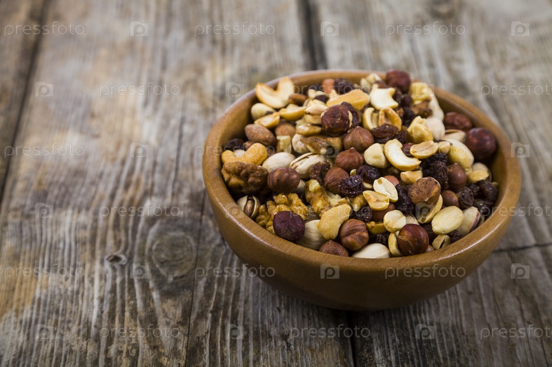 Орехи в деревянной миске на деревянном столе