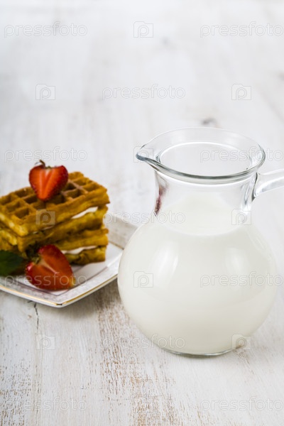Вкусная вафля с ягодами и кувшин молока