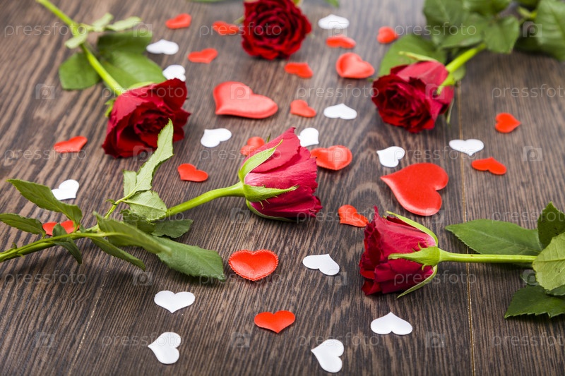 Красные розы и сердца на деревянном фоне