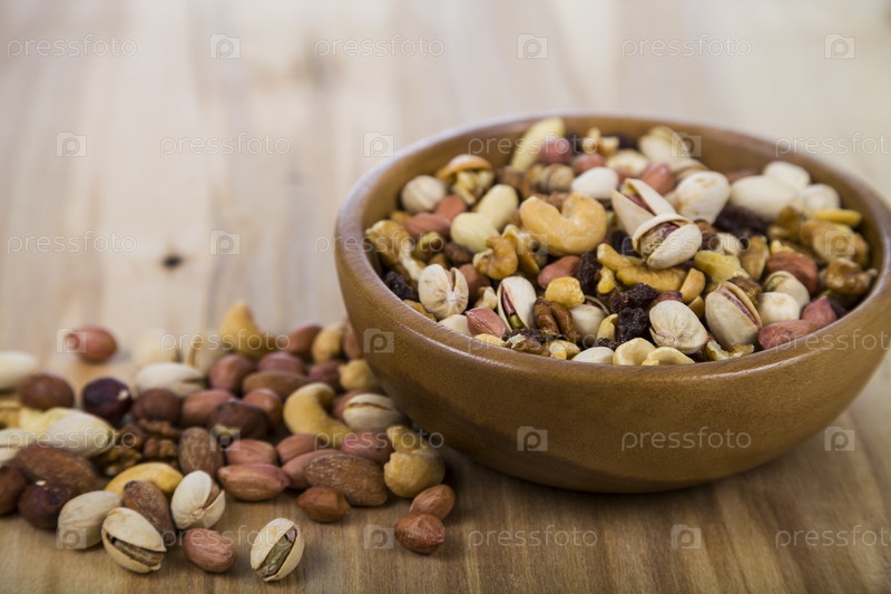 Орехи в деревянной миске на деревянном столе