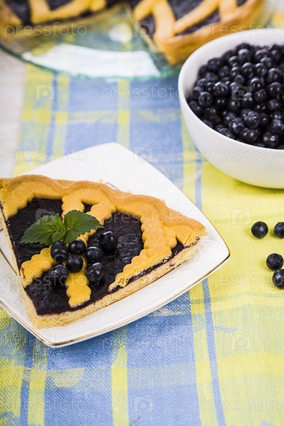 Кусок черничного пирога и свежих ягод на деревянном столе