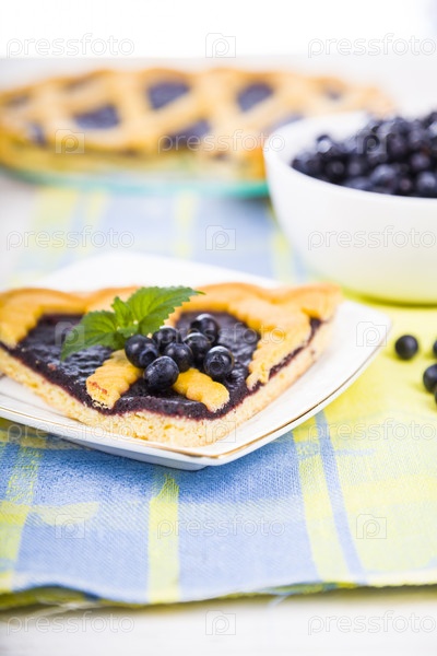 Кусок черничного пирога и свежих ягод на деревянном столе