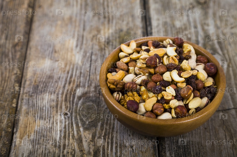 Орехи в деревянной миске на деревянном столе