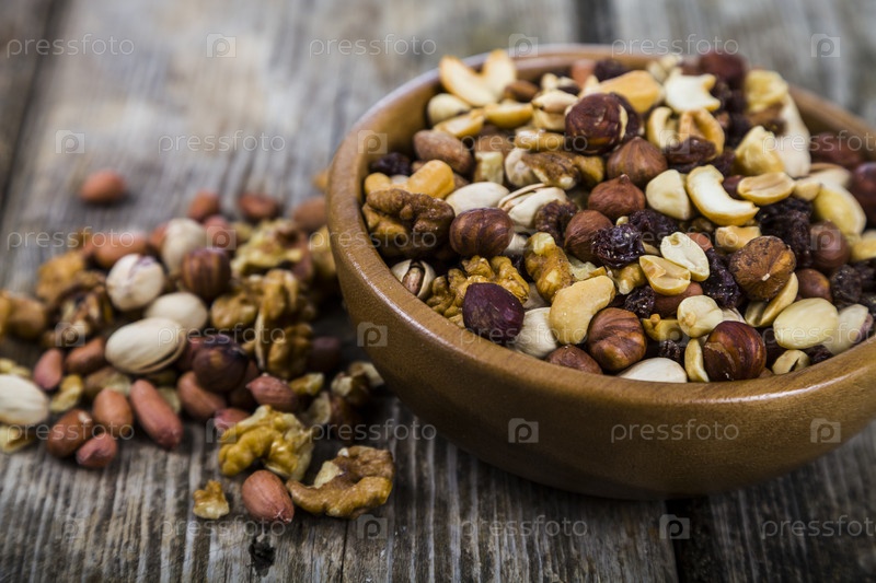 Орехи в деревянной миске на деревянном столе