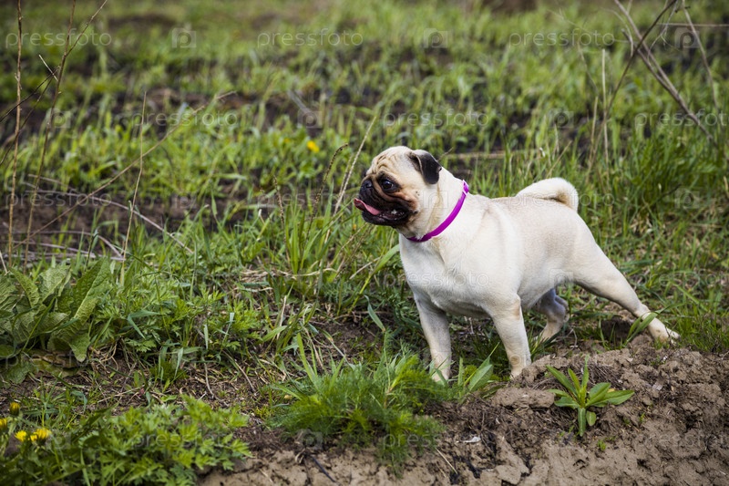 Мопс стоит на зеленой траве