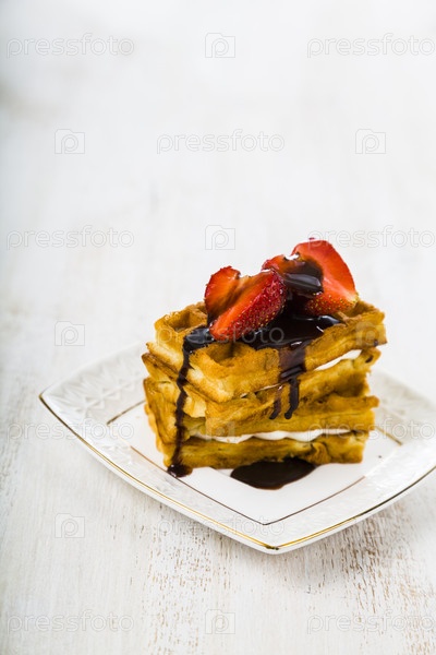 Вкусная вафля с ягодами и шоколадом на деревянном столе