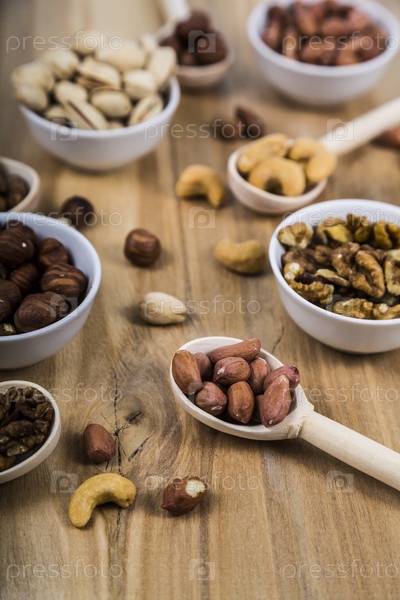 Орехи в деревянных ложках и мисках