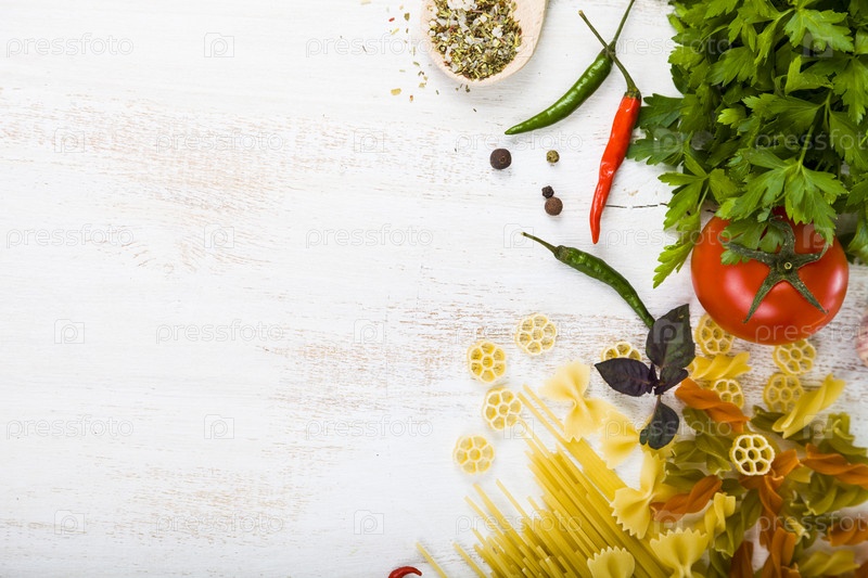 Сырая паста и специи на деревянном столе