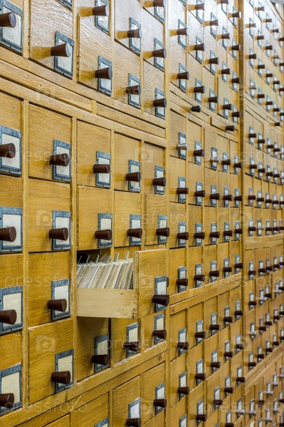 Старый деревянный картотечный каталог в библиотеке