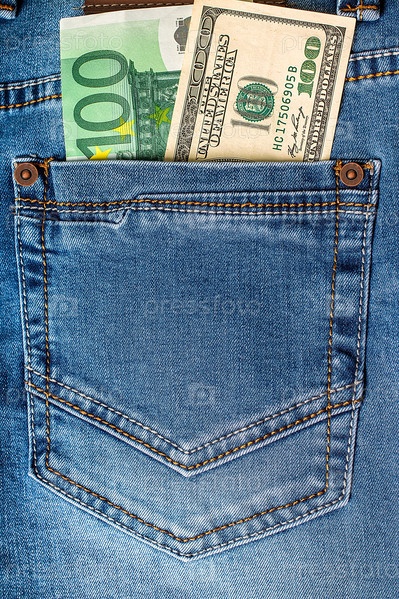 Банкноты доллара и евро в джинсовом кармане