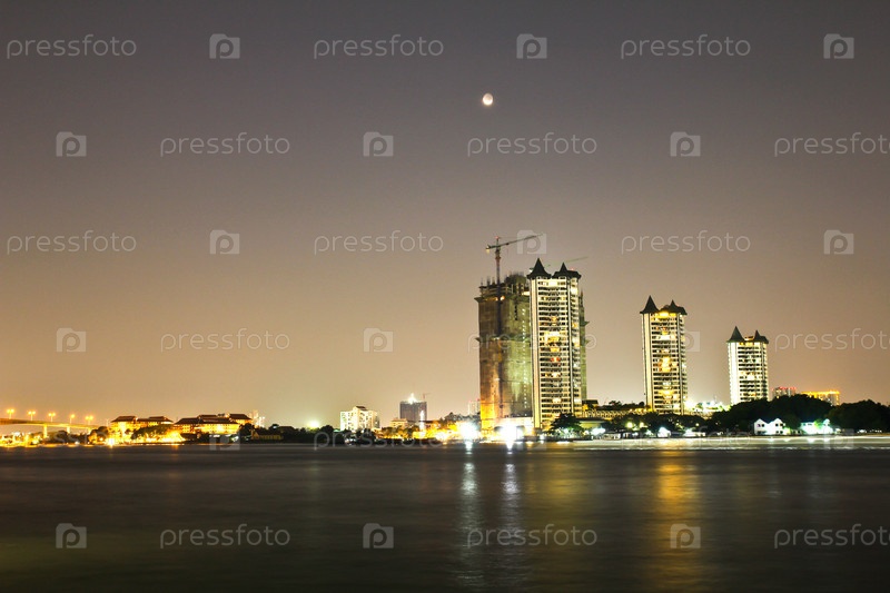 Здания вдоль реки ночью. Достопримечательности в Бангкоке, Таиланд