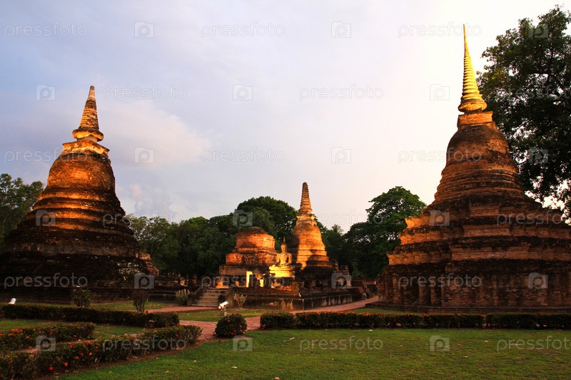 Исторический парк Сукхотай в сумерках, старый город Таиланда в 800 году назад