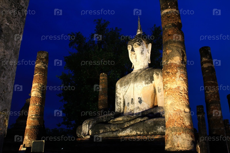 Статуя Будды в сумерках, Ват Махатхат в историческом парке Сукхотай, Таиланд