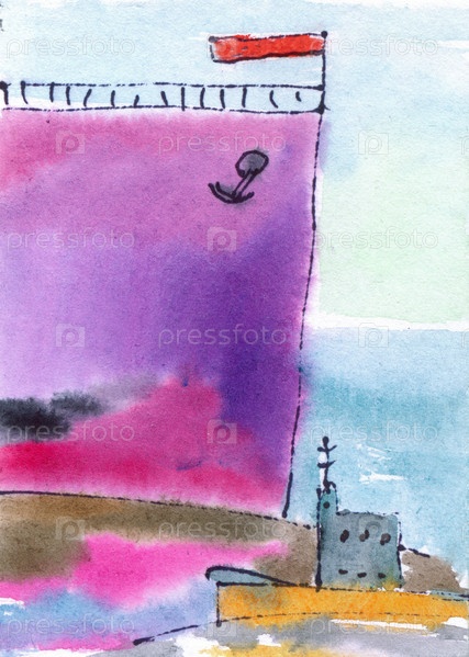 Корабли в море. Акварельная открытка