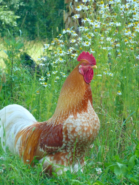Пестрый петух среди ромашек