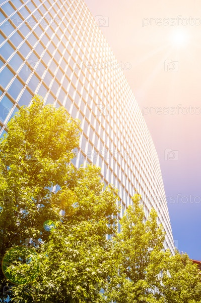 Современное офисное здание с зелеными листьями и солнечным светом