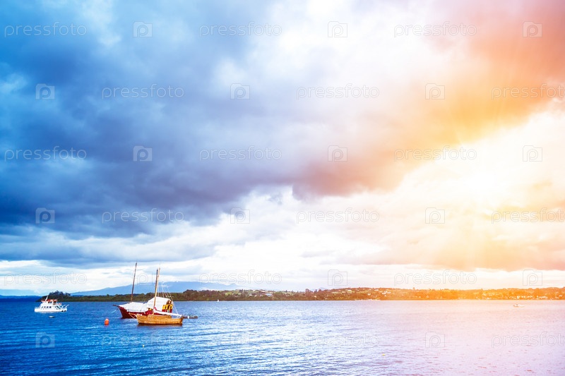 Голубой океан с лодками и береговой линией