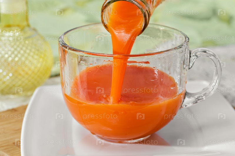 Морковный сок наливают в чашку из бутылки