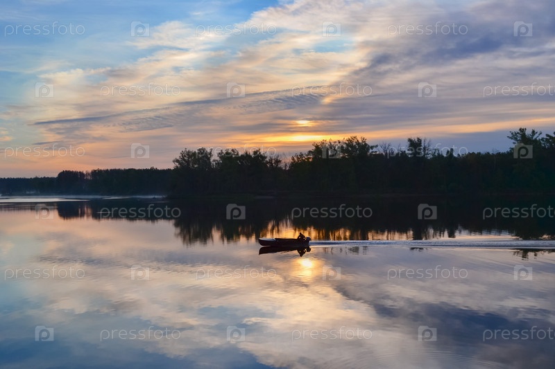 Силуэт лодки с рыбаком на реке на рассвете