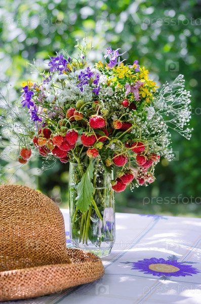 Букет из клубники на столе в саду