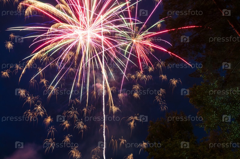 Фейерверк на фоне темно-синего неба и деревьев
