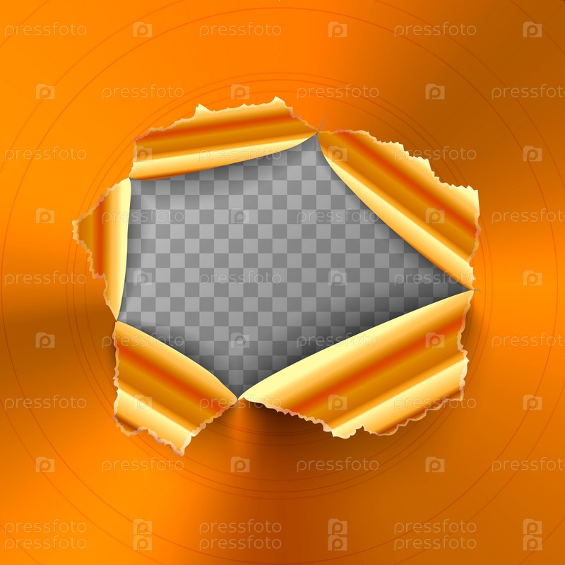 Порванное отверстие в блестящей круглой полированной бронзовой металлической пластине