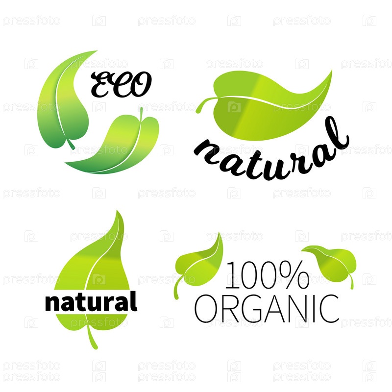 Набор зеленых листьев, экологические знаки на белом фоне