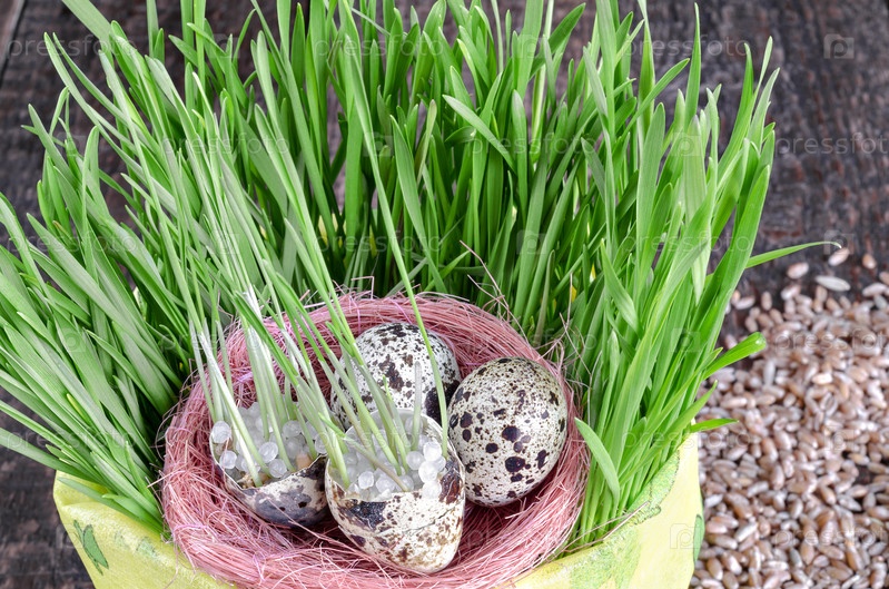 Гнездо с перепелиными яйцами в горшке с травой