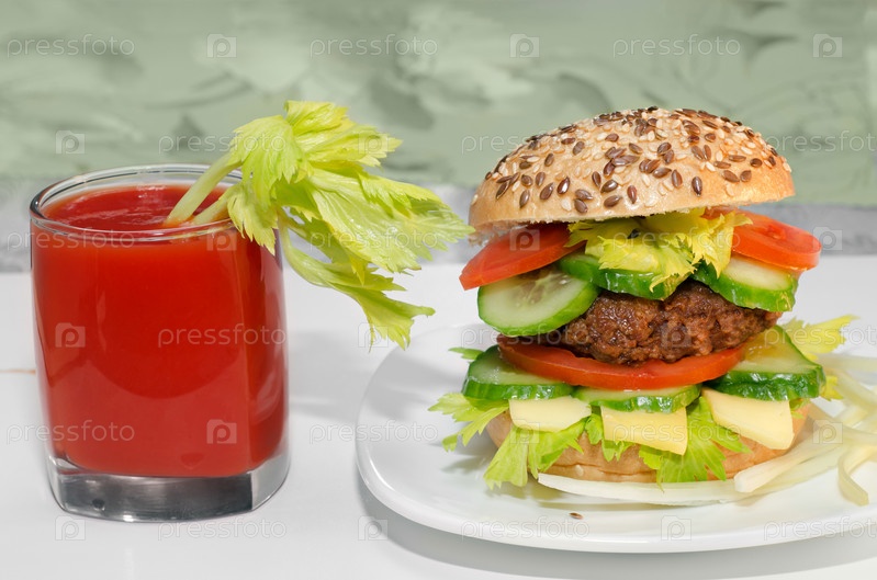 Гамбургер и томатный сок с сельдереем