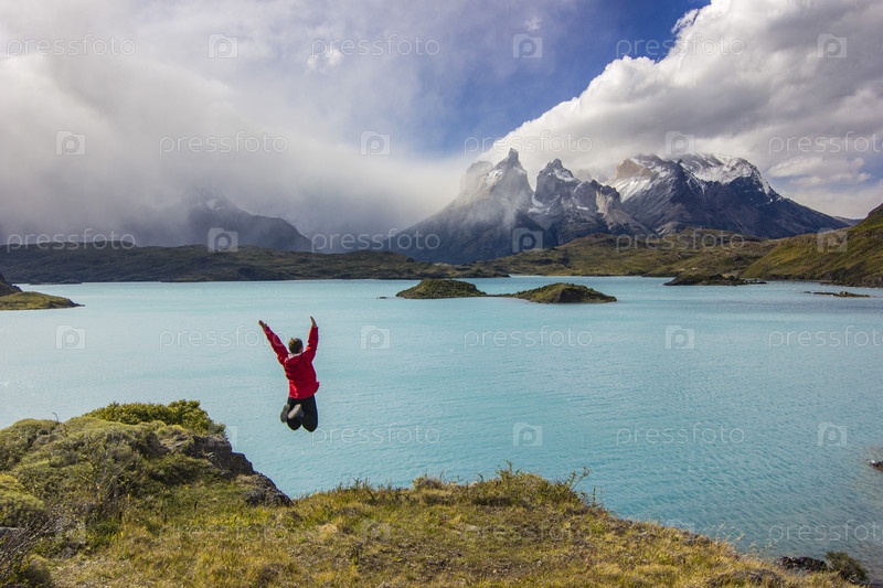 Девушка прыгает над озером в горах