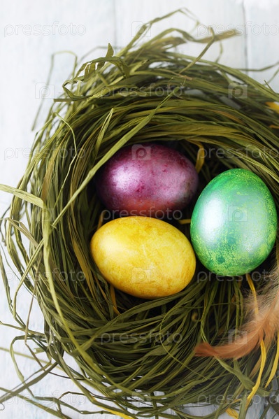 Зеленое гнездо с крашеными яйцами