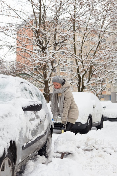 Женщина откапывает машину