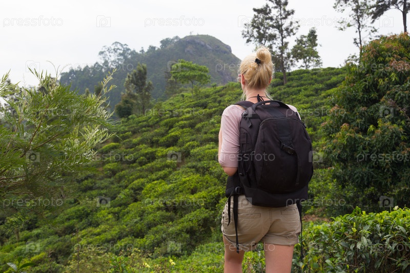 Туристка наслаждается красивой природой чайных плантаций, Шри-Ланка