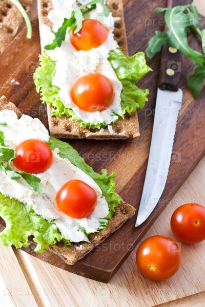Хлебцы с сыром, салатом и помидорами черри