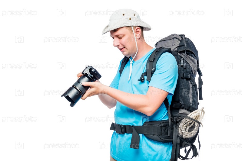 Портрет мужчины с рюкзаком для треккинга и камерой