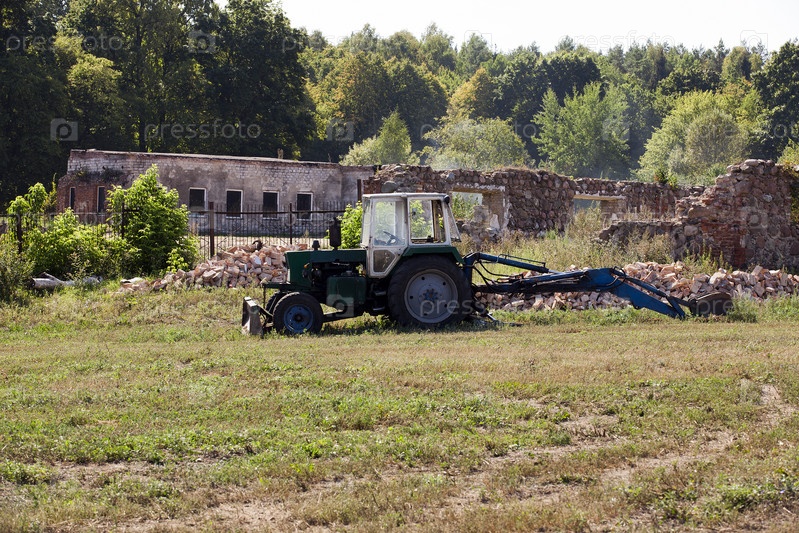 Руины здания, трактор