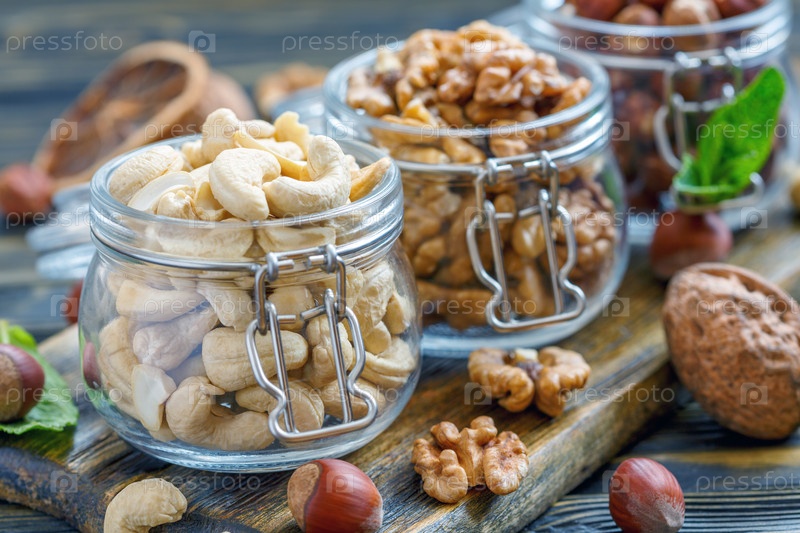 Кешью и грецкие орехи в стеклянных банках