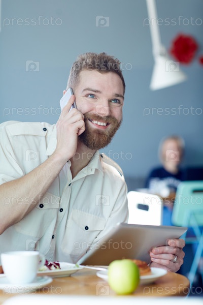 Улыбающийся красивый мужчина с помощью устройств в кафе
